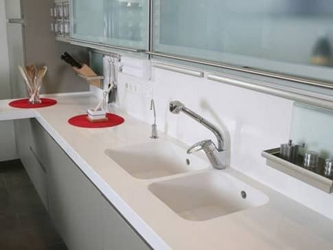 Столешница белого цвета с мойкой из камня